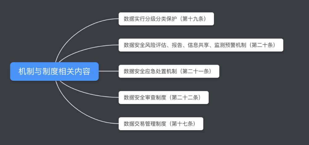 又如第十七条,明确国家建立健全数据交易管理制度,规范数据交易行为,培育数据交易市场,后文在第三十和第三十一条,继续明确了数据交易相关的相关要求和主管部门。