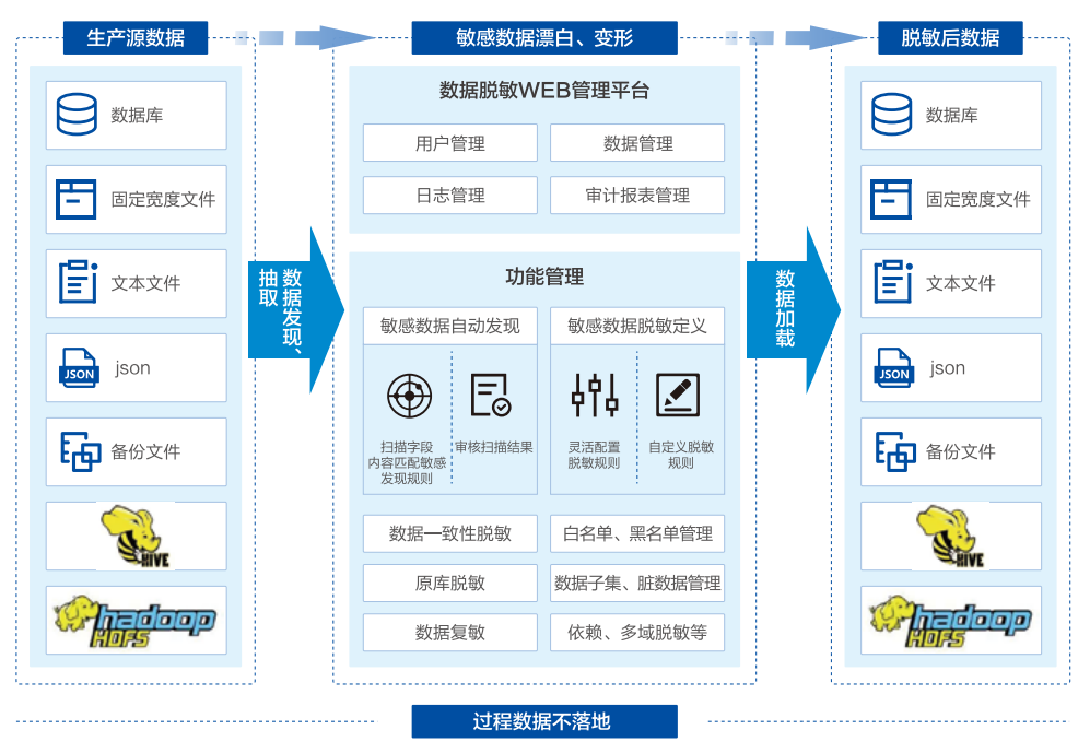 包含客户姓名等敏感信息数据通过脱敏系统变成符合数据使用场景的非敏感数据,使敏感信息保持在可控业务系统内部,明显降低敏感数据泄漏风险。