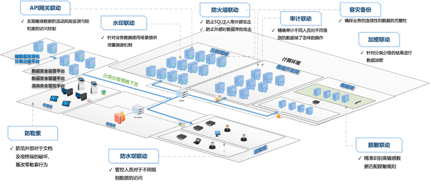 数据分类分级作为工业领域数据安全管理与防护体系建设的基础,美创数据安全分类分级平台内置工业企业相关标准业务发现模型和分类分级模版,基于机器学习等智能化技术,帮助用户高效持续化盘点数据资产和分类分级,DSM Cloud基于分类分级结果和身份治理,统筹规划相应数据保护策略,实现基于分类分级的安全策略联动,同时DSM Cloud可围绕数据、身份全生命周期变化,提供安全策略的自适应进化、安全编排自动化响应能力,实现智能化安全防护。