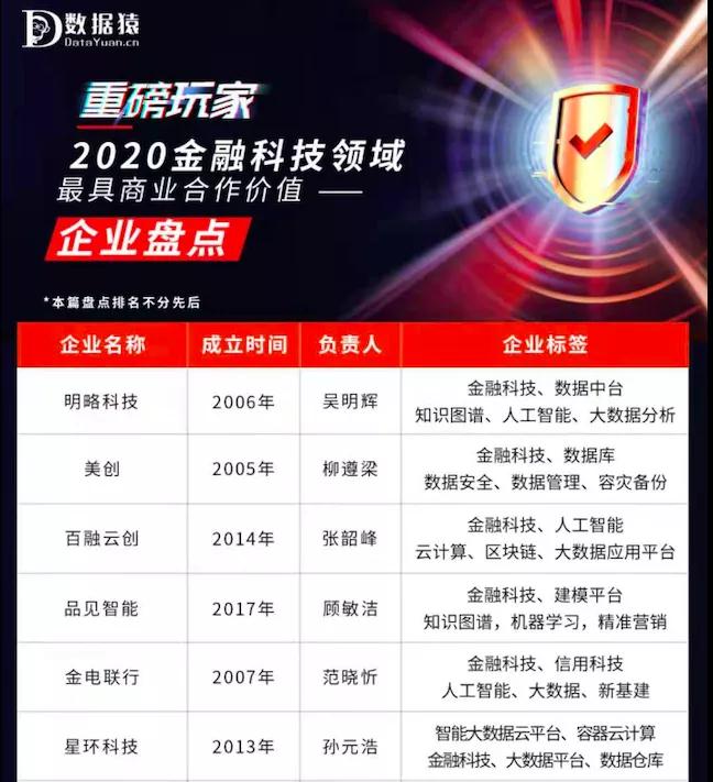 《2020金融科技领域最具商业合作价值企业盘点》旨在挖掘“垂直专业领域背后,默默付出的英雄企业”,帮助金融行业用户寻找到行业中“靠谱的重磅玩家”。此前数据猿 “中国数据智能产业最具商业合作价值企业”系列评选中,美创科技曾入选《2020中国数据智能产业图谱1.0》多个细分领域,并上榜《2020智慧政务领域最具商业合作价值企业盘点》。