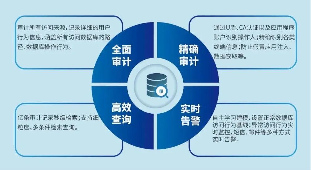 美创数据库安全审计系统以安全事件为中心,以全面审计和精确审计为基础,对数据库的各类操作行为进行监视并记录,实现数据库实时风险告警,为企业保护自身合法权益提供有力依据。
