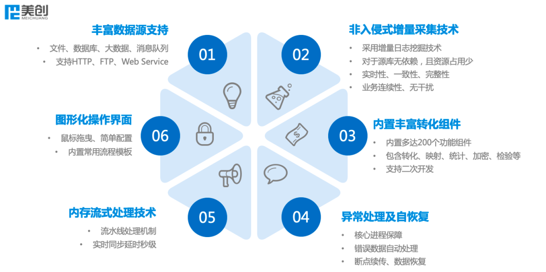 采用内存流式处理技术,以应对源端大数据量及复杂数据转换场景,通过流水线式的处理机制,将处理流程整体处理时间压缩到与单个组件的处理时间上,实现数据实时同步秒级延时。