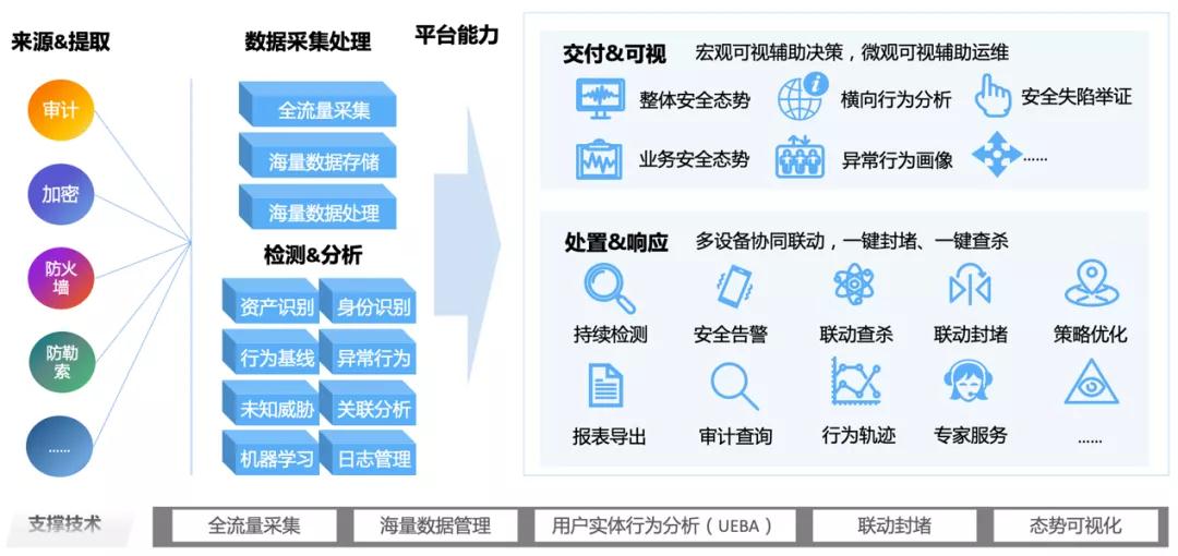 平台集成了全流量聚合存储、海量信息处理和查询、资产全量识别盘点、用户行为(UEBA)深度分析、大数据实时智能响应、风险监测反哺等功能,帮助企业实现资产全域可管、风险全域可视、策略全域联动的目的,充分盘活用户整体数据安全防护能力。