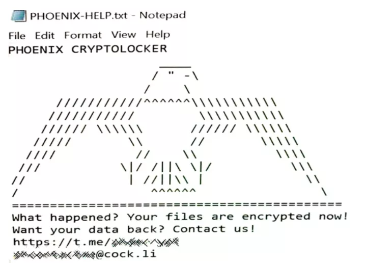 在整个加密过程中,勒索软件为所有加密文件添加了“.phoenix”扩展名,并创建了一个名为“PHOENIX-HELP.txt”的勒索票据。