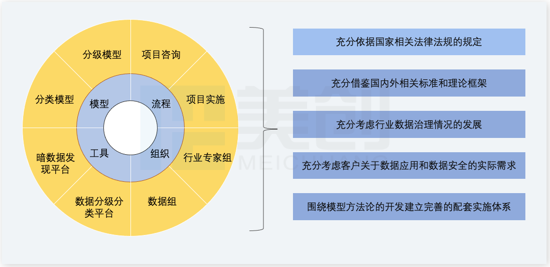 为满足国家所提出的数据分类分级要求,保证分类分级的规范性,同时有效提升分类分级的准确性和效率,美创科技在结合自身数据安全经验及对相关法律法规、国内外标准研究基础上,形成了一套可操作落地的方法论和配套软件工具,总体设计原则如下图: