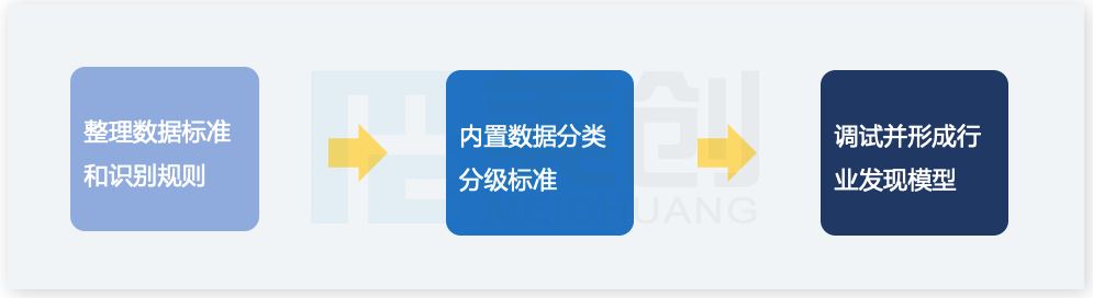 在部署和使用产品进行资产梳理之前,需要先将制定的分类分级策略关联和内置到产品中,形成行业数据发现模型和分类分级模版,流程如下: