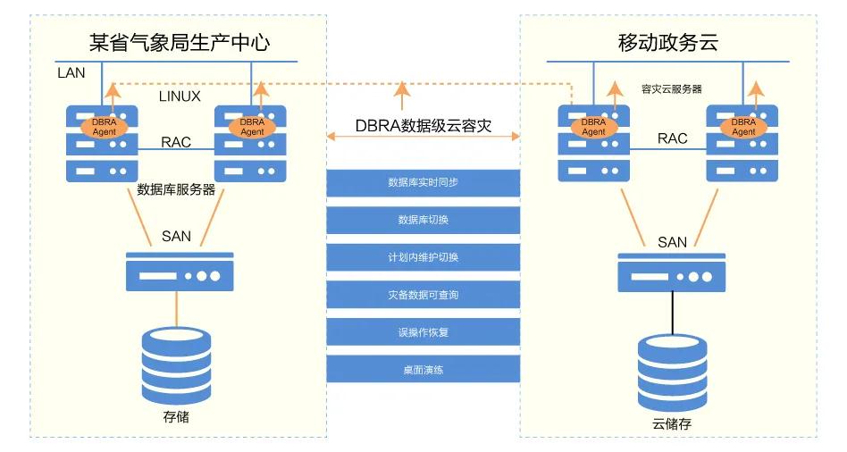 为了解决数据丢失和业务可持续性问题,该气象局对主要核心业务做了双节点RAC集群管理,同时计划把核心数据实时同步到移动政务云,当业务中心发生问题时,业务可以随时切换到政务云,以保障业务持续运行。