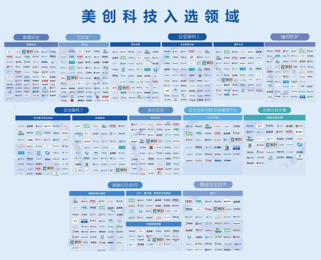 美创科技入围九大安全方向包括:数据安全、云安全、身份安全、端点防护、安全服务、基础安全技术、威胁对抗/防控、安全指挥控制/安全管理平台、新兴安全领域。