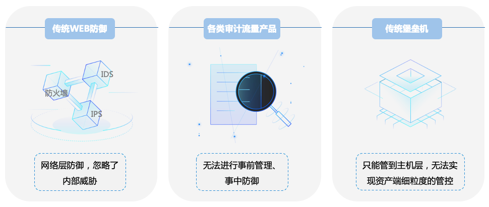 传统IDS、IPS、下一代防火墙、WAF等传统安全设备在抵御常见的网络攻击发挥重要作用,但如今在日渐模糊的网络边界中,如果仍依赖以“网络为中心”的防御方式,安全防护措施的片面性将带来防护重心的严重失衡,现如今企业内部风险盛行:黑客入侵内网后,通过盗取数据库账号登陆数据库即可窃取数据,运维环境本身多职位、多人员的数据库访问造成内部数据泄露、删库跑路,这都已超越传统安全手段的能力范围。