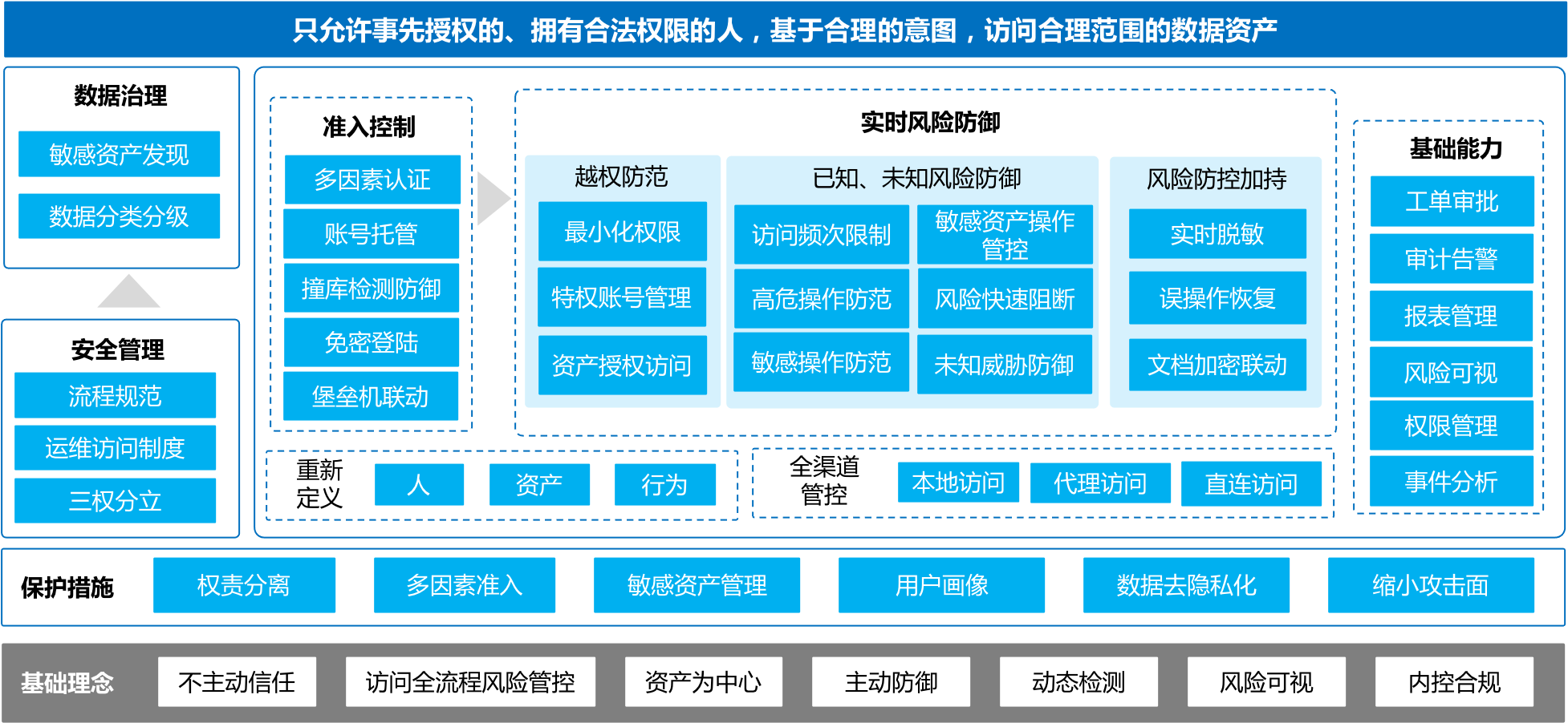 如上所说,组织机构内部若建立行之有效的数据安全防护体系,显然需从根本消除对内部人员的无条件信任,对 “人”在数据访问过程中所具备的一切特征进行重新的审视、定义,建立以“身份”和“资产”为中心的主动式防护体系。