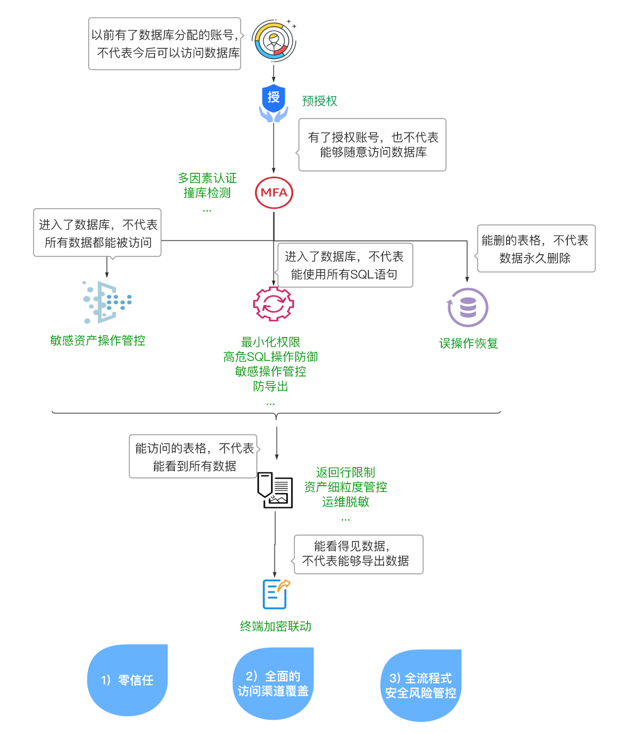 作为一款通过帮助用户主动建立运维访问模型,保证敏感数据资产可管、用户访问行为可控、返回结果可遮盖的数据库运维安全风险管控产品,产品从敏感数据的快速发现和管理、严密的身份准入机制、资产细粒度管控、动态访问控制、误操作恢复、合规审计等方面全面支持数据库运维安全管控。