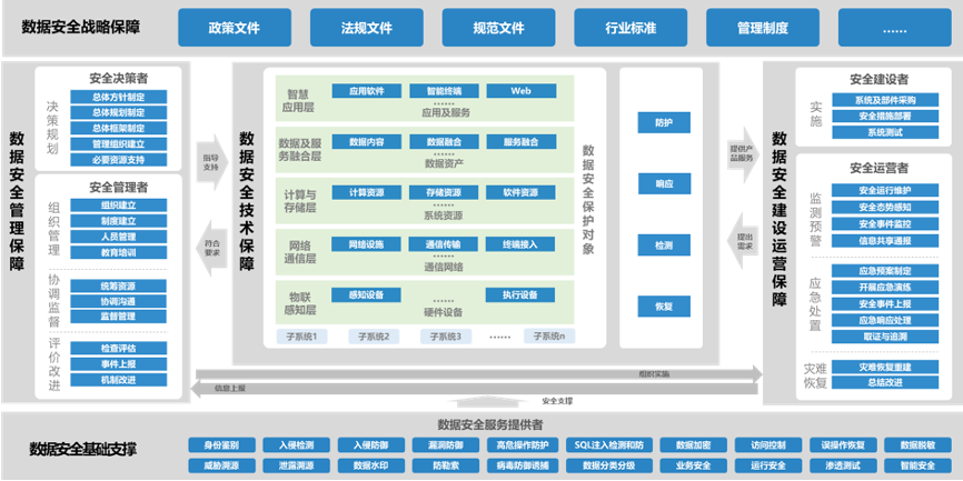 政策法规及标准规范:围绕安全责任主体,实现对数据资源采集、汇聚、共享、开放和应用的法制化管理和标准化建设,让数据共享、应用、公开、保密等工作有法可依、有规可循,明确数据提供方、数据使用方、数据管理方、平台运营方、服务提供方的安全职责和义务。