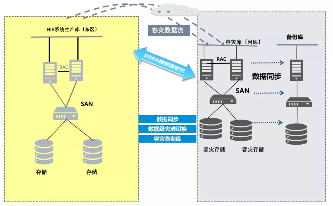 首先在河医院区数据中心建立HIS系统oracle 11g数据库,并将郑东院区数据迁移至河医院区,完成后把业务系统切换到河医院区,由河医院区暂提供对外业务。