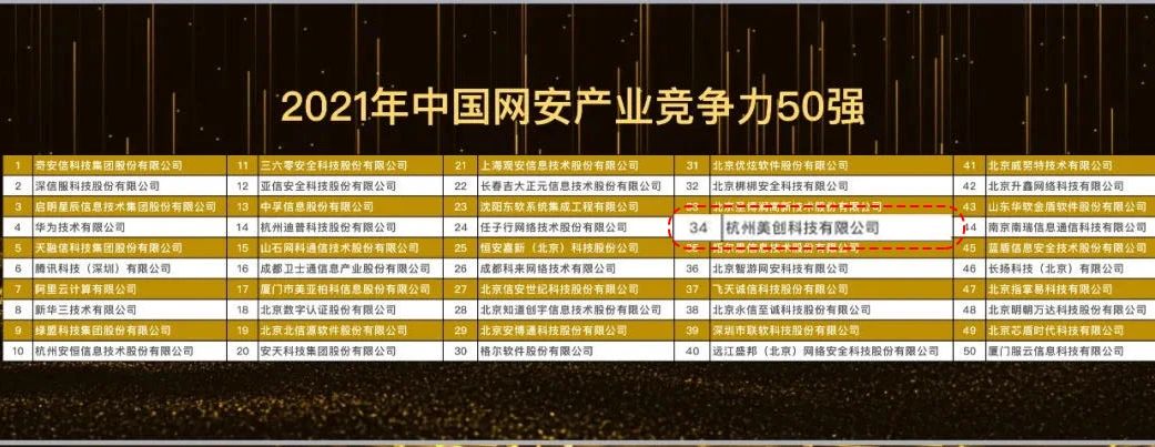 数据出境安全治理服务 数据安全能力评估认证服务 数据安全风险评估服务 数据安全治理咨询服务 数据分类分级咨询服务 个人信息风险评估服务 数据安全检查服务6月16日,在“2021CCIA网络安全产业发展论坛暨网络安全优秀创新成果大赛启动仪式”上,中国网络安全产业联盟正式发布《2021中国网络安全市场竞争力报告》,揭晓“2021CCIA50强、CCIA成长之星、CCIA潜力之星”榜单。凭借在数据安全领域领先的技术实力和市场表现,美创科技再次上榜CCIA50强,位列34名,比2020年排名进步9名。