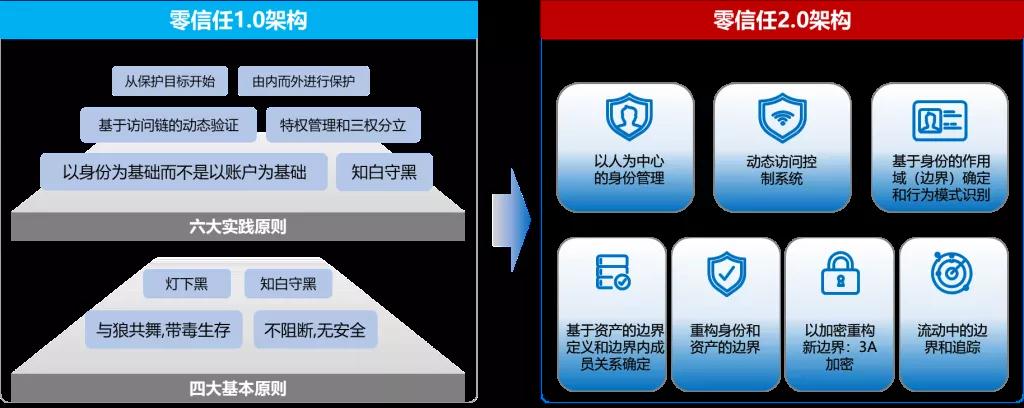 零信任安全(或零信任网络、零信任架构、零信任)最早由约翰·金德维格(JohnKindervag)在2010年提出,美创科技同期并行提出零信任安全体系,并加以实践,是全球最早的零信任安全体系架构构建者和实践者之一。2020年,美创科技在零信任1.0架构的基础上提出了零信任2.0架构,其最核心的变化在于重新定义了边界,让零信任架构变得更加清晰(如图2所示)。