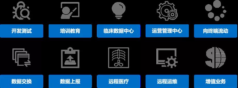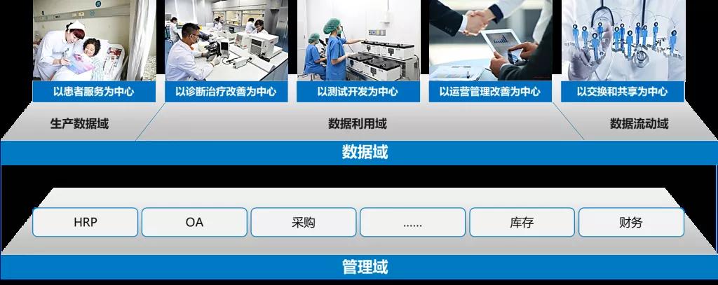 《从医院的五个数据域解剖安全风险》一文详细分析了医院的5个数据域(图4):以患者服务为中心的生产数据域、以诊断治疗改善为中心的数据利用域、以运营管理和改善为中心的数据利用域、以测试开发为中心的数据利用域、以交换和共享(互联互通)为中心的数据流动域。此外,还有以流程管控为中心的管理领域,比如HRP、OA、采购、库存、财务等。