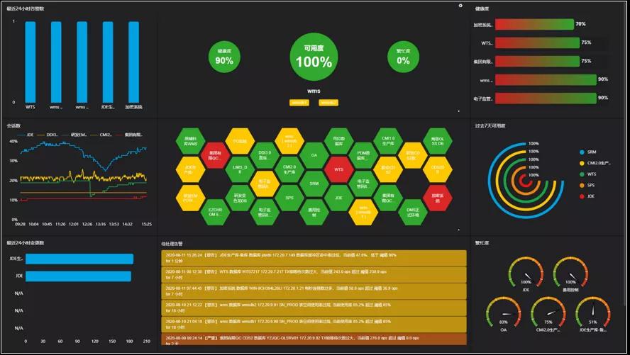 采用聚合全景大屏和单个资产聚焦大屏(如图8所示),对所有数据库对象实现聚合监控及单一对象的详细监控,分层展示数据库运行状态,实现直观、精准、高效的运行风险可视化管理。运维人员可以直观清晰地了解到各数据库对象及其对应的业务系统的整体运行情况,确保业务系统的连续稳定可用。告警自动关联运维工具,实现告警发现到故障解决的运维闭环。
