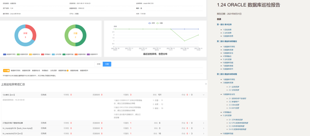 通过OSM全面巡检工具,全面、深度分析主机和数据库运行状态,有效定位系统隐患和资源瓶颈,一键操作即可完成数据库的全面而深度的检查工作。从数据库的可用性、数据库资源、数据库安全、物理备份、主机资源数据库性能、数据库参数以及数据库软件等八个维度实现数据库的巡检分析工作,保证数据库检查的全面、深度和准确性,并提供多种格式的巡检报告。