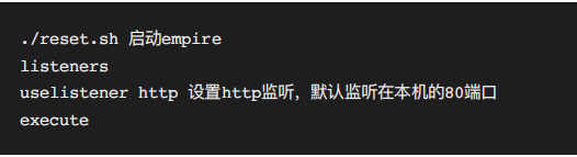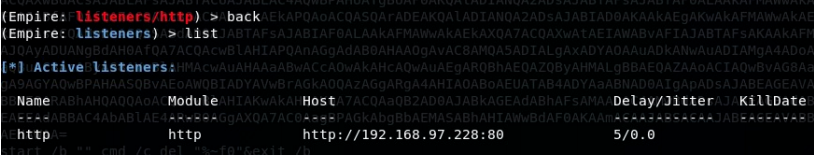 使用empire进行监听,并利用empire生成恶意的sct文件,安装过程不提,首先启动监听