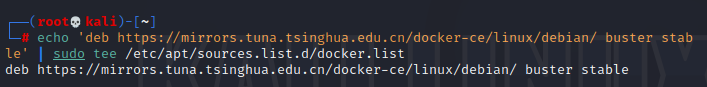 echo 'deb https://mirrors.tuna.tsinghua.edu.cn/docker-ce/linux/debian/ buster stable' | sudo tee /etc/apt/sources.list.d/docker.list