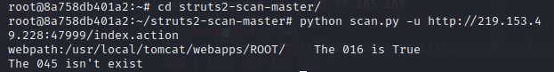 (3)扫描目标是否存在Struts2漏洞,如下图所示,可以看到目标存在S2-016漏洞