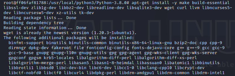apt-get install -y make build-essential libssl-dev zlib1g-dev libbz2-dev libreadline-dev libsqlite3-dev wget cu