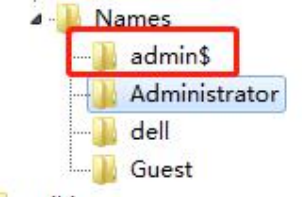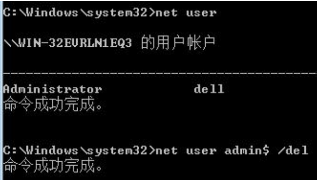 (6)这时候,删除刚才创建的用户,admin$用户(net user 发现不了,但可以删除)如下图;