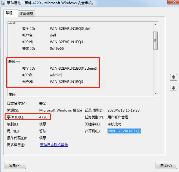 (3)查看系统安全日志,可以看到事件 ID 为 4720(已创建用户账户)的日志。