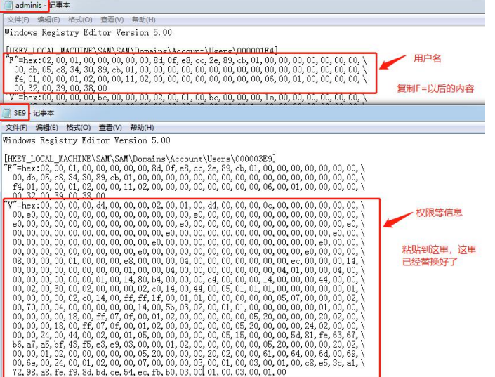 (7)接下来复制 administrator 的注册表文件(导出的 adminis.reg)里的用户名到 3E9.reg 里相应位置,保存 3E9.reg。
