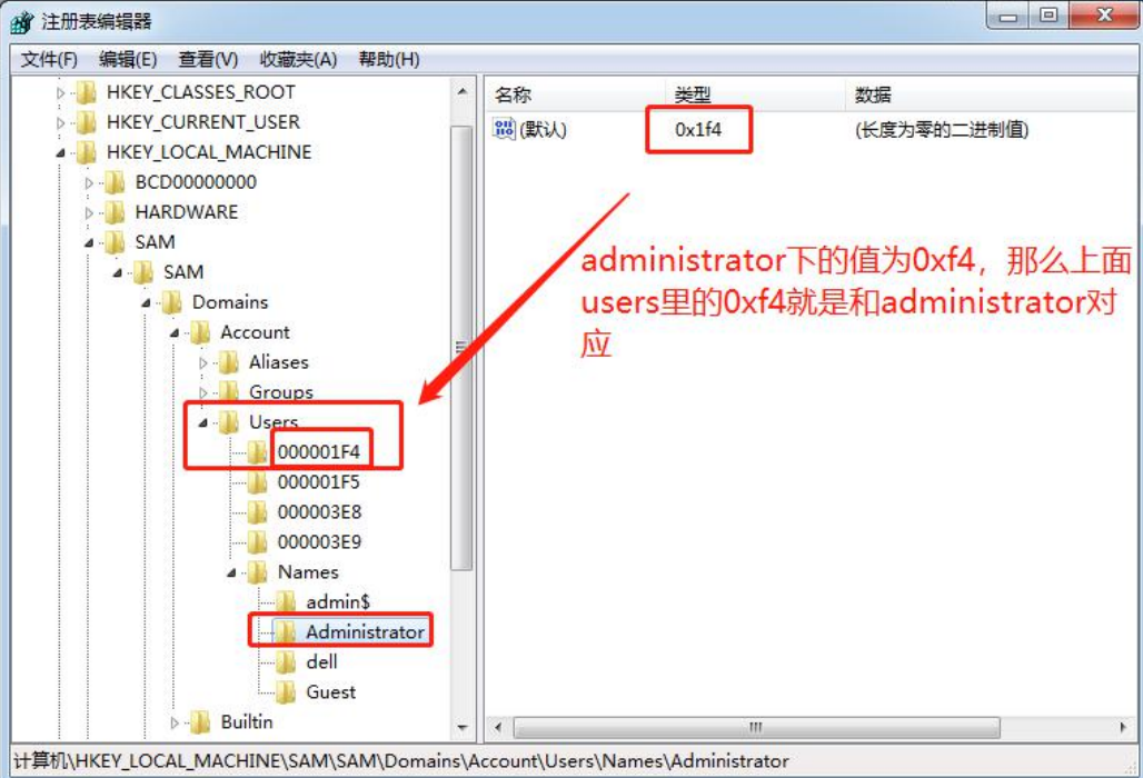 (3)Names 里存放的子键是和 Users 里的子键一一对应的,如 Names 里的 Administrator,点击后会出现 0xF4 的注册表,那么 Users 里也会有相同命名的子键。如下图