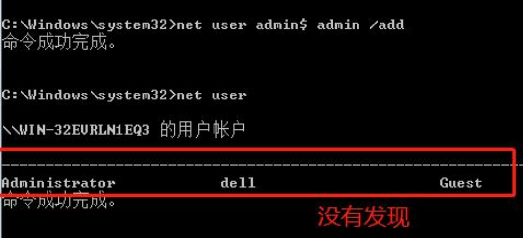 (1)net user admin$ admin /add,创建admin$隐藏账户,且net user 命令无法发现隐藏用户。