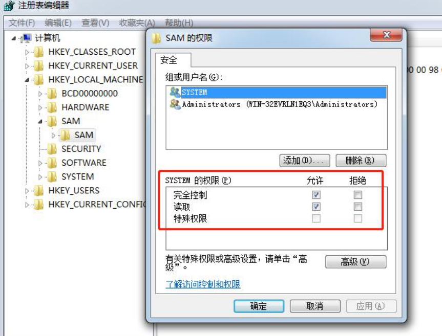 (1)点击开始→运行,输入 regedit 来打开注册表编辑器,在这个注册表编辑器里可以对系统账户的键值进行修改操作。找到 HKEY_LOCAL_MACHINE→SAM,右击第二个 SAM,给用户配置权限,如下图: