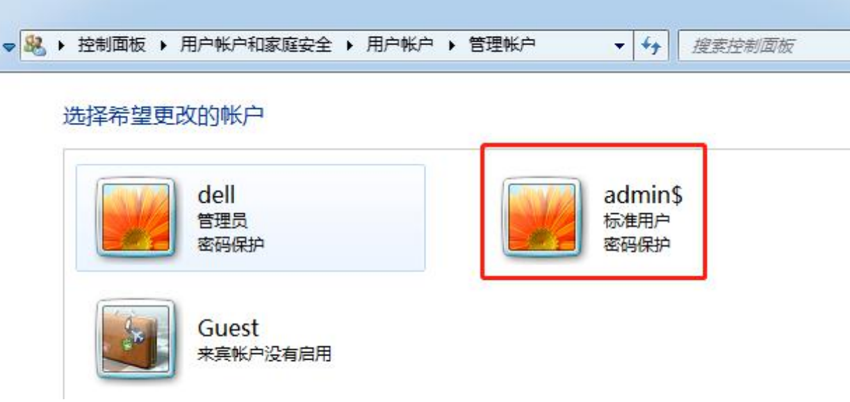 (2)控制面板——账户管理中,可发现该隐藏账户