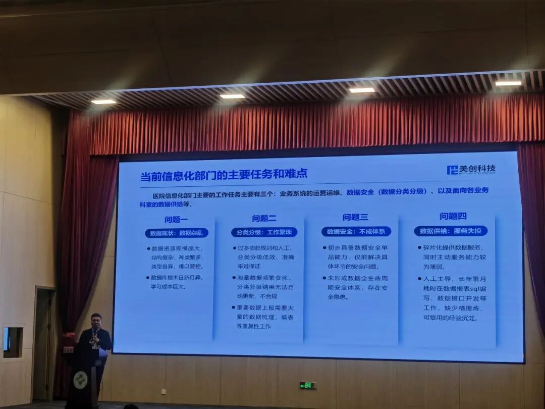 美创科技技术总监张建林在主题演讲中,紧扣国家医疗数据安全相关政策要求与行业实际痛点,从数据分类分级和供给难点、基于AI的精准化分类分级、基于AI的便捷化数据供给三大维度展开分享。